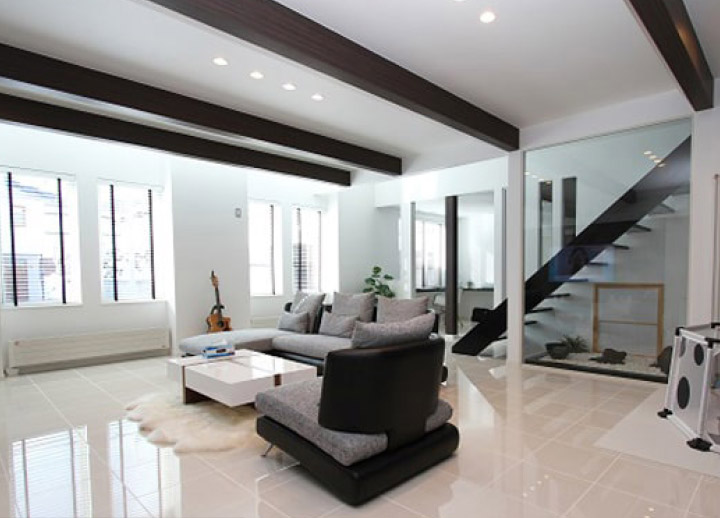 直線的で端正な印象の現代的な雰囲気を醸し出すテイストです。シンプルで機能的なデザインが特徴で、モルタルがむき出しの玄関やステンレスのキッチン、ガルバリウム鋼板を使った外観、スチール製の階段などスッキリとして目を引くスタイリッシュな作りが特長です。
